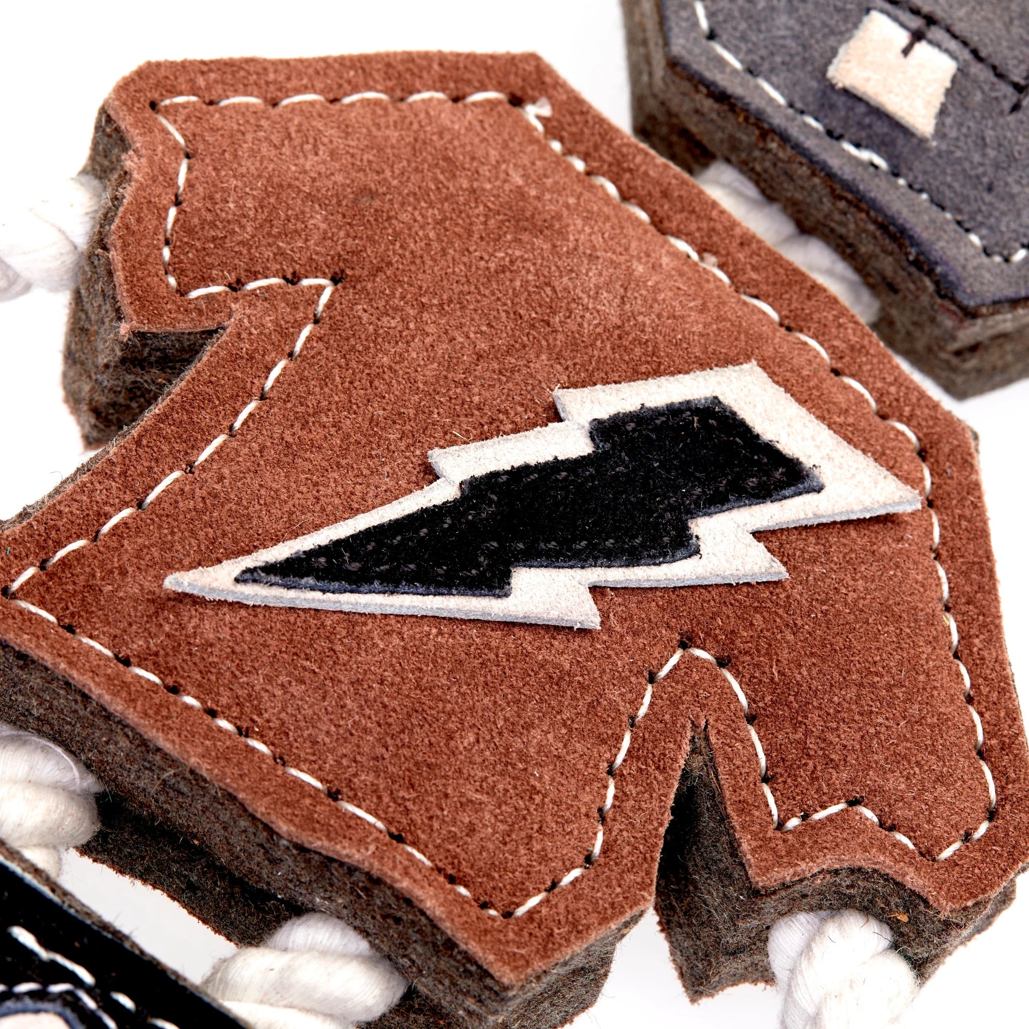 This larger-sized eco toy, combines layers of compressed felt, stitched over with soft suede, and lots of jute rope to chew or tug on. Jute and wool felt are 100% biodegradable and sustainable. The suede is a by-product, ensuring that this material is not wasted. It is tough and long-lasting and is produced without using any added compound that would harm or be released when chewing. This ensures hours of safe fun for you and your dog.